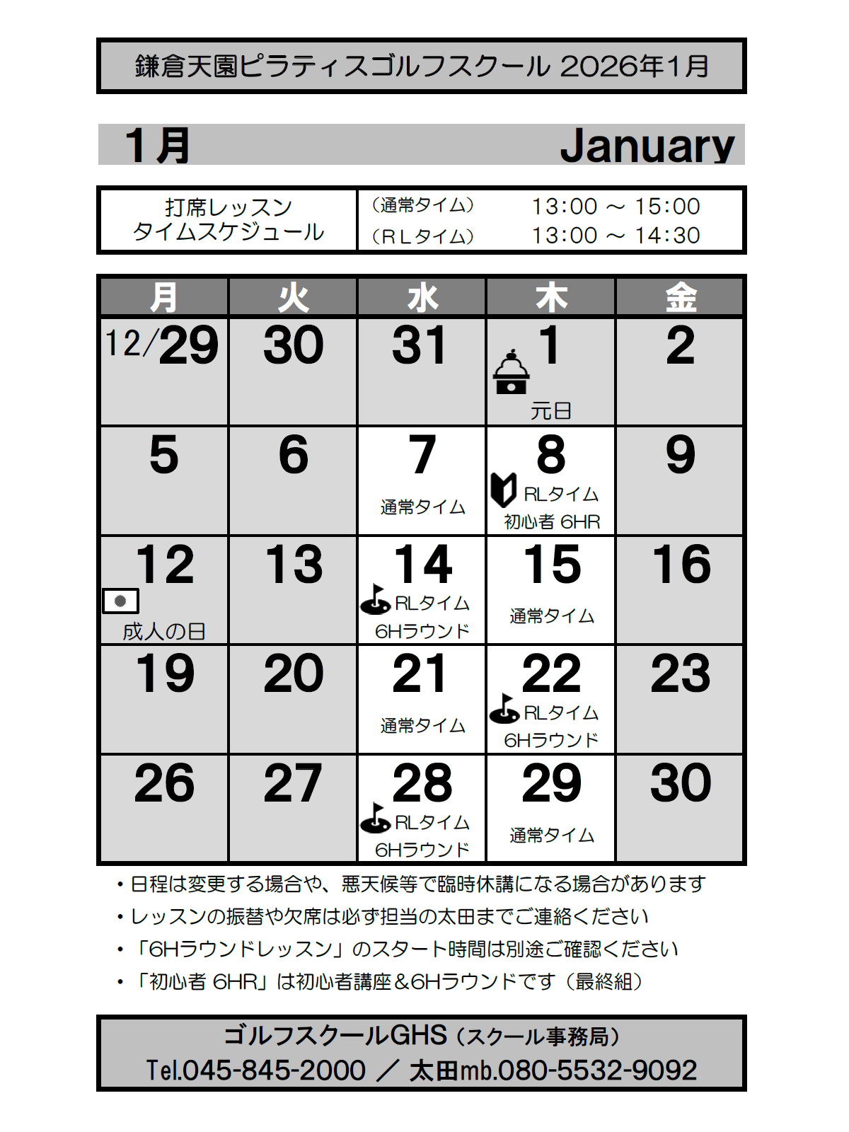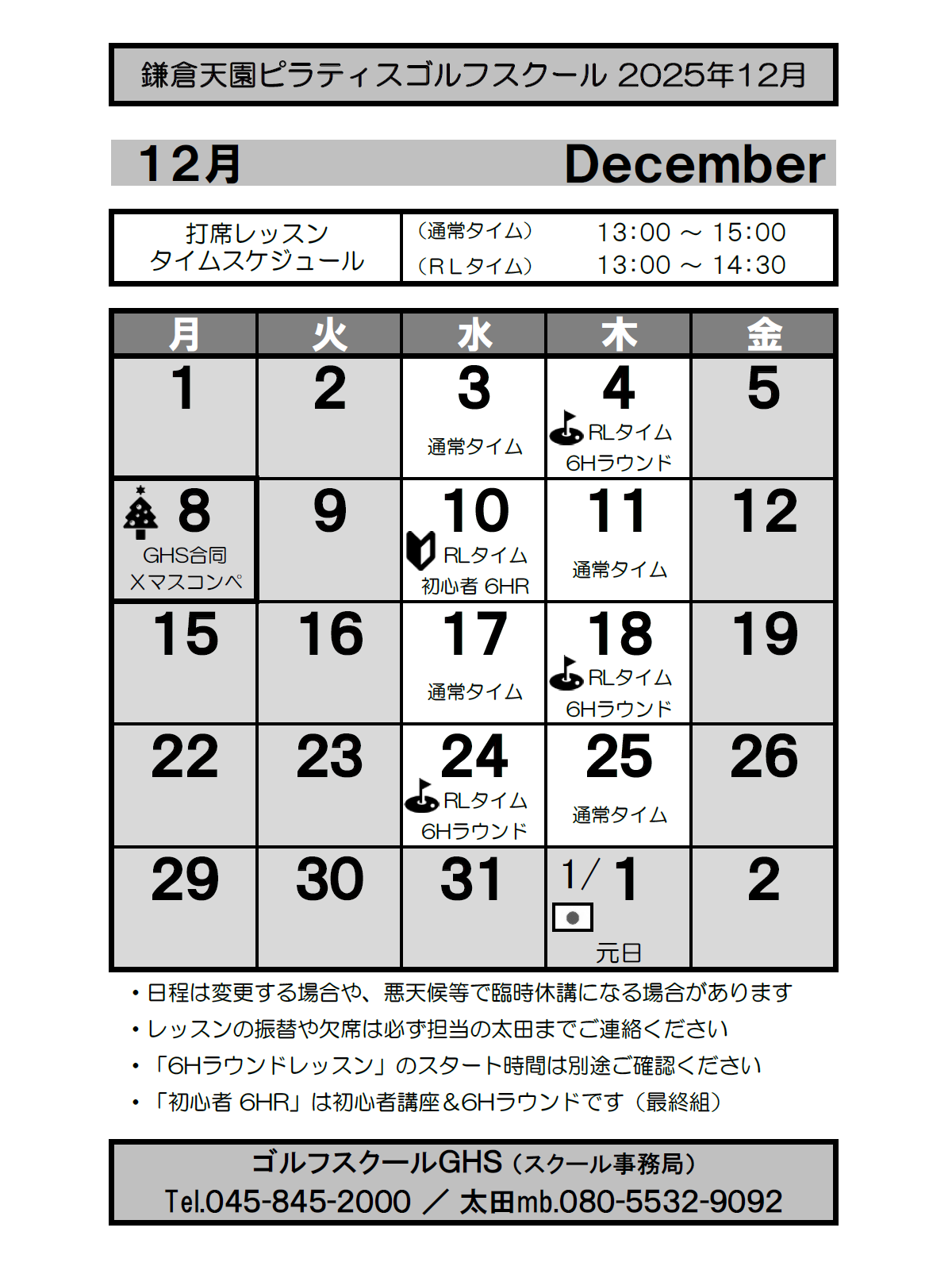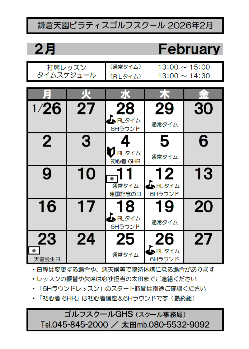 13:00〜15:00 ※薄暮ラウンドレッスン実施日は 13:00〜14:30 |